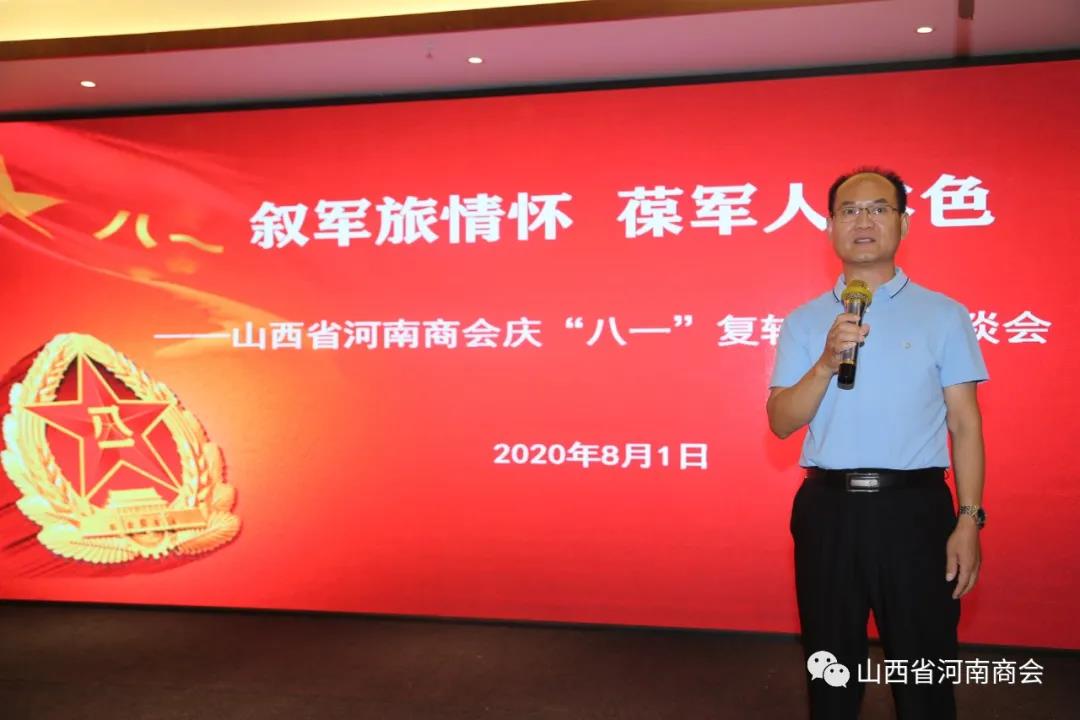 为纪念建军93周年,讴歌伟大的人民军队。2020年8月1日下午,山西省河南商会在相豫多功能厅组织召开了 “叙军旅情怀葆军人本色—— 庆‘八一’复转军人座谈会”。商会顾问中的军转干部和会员企业复转军人、商会班子成员等30余人参加。会议由复转军人、副秘书长白顺亭主持。