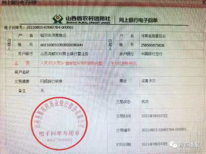 7月22日,临汾市河南商会第一时间召开班子成员会议,提出了为老家河南抗洪救灾捐款的倡议,发出了“临汾市河南商会支援郑州抗洪救灾捐款倡议书”。截至目前,共收到善款 137800元,善款专款专用,这些善款临汾市河南商会已向河南省慈善总会转账捐赠。