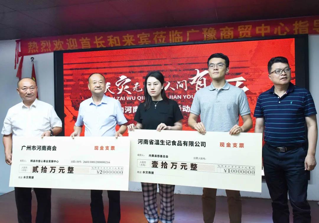 7月21日以来,广州市河南商会联系广州市社会组织联合会,通过河南省人民政府驻广州办事处向郑州市捐款600万元,商会秘书处发动募集到会员和社会爱心人士向新乡辉县市捐款20万元,永久名誉会长温国军企业温生记食品公司向安阳内黄县捐款10万元。