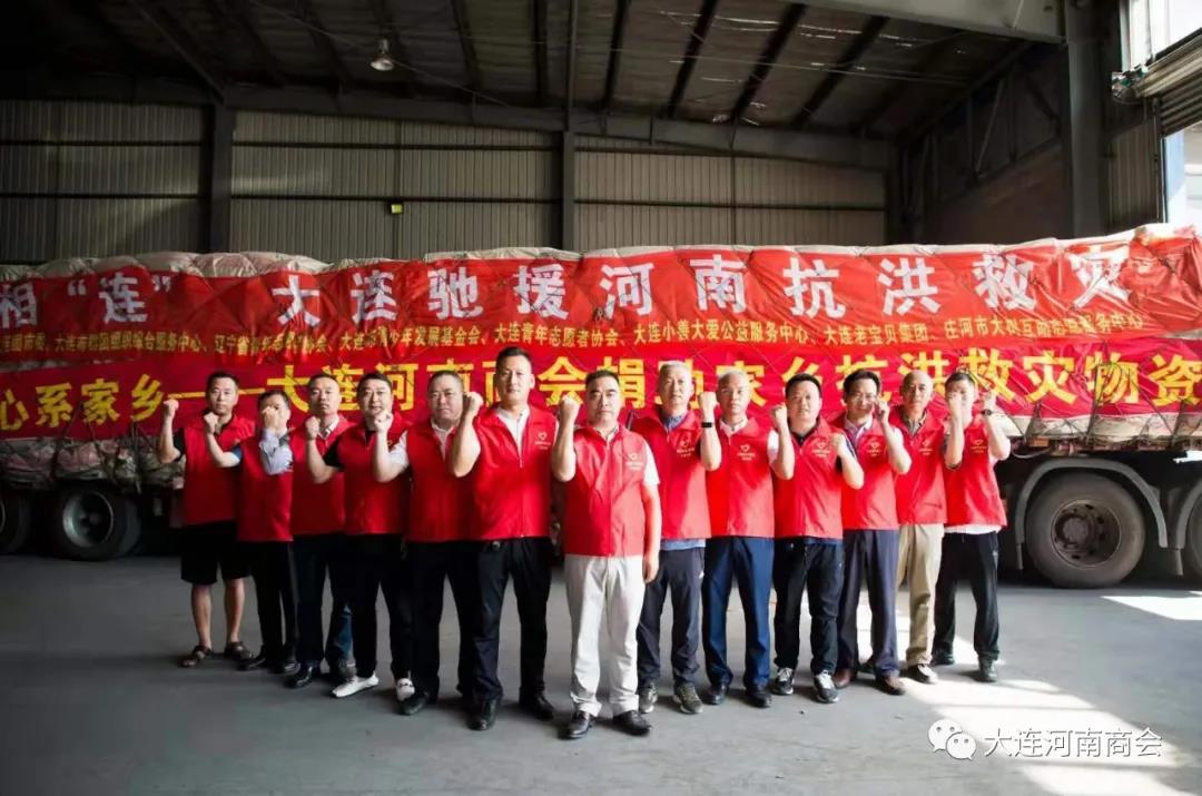 7月27日,大连河南商会向新乡、鹤壁两个重灾区运送去了价值40万元的一批物资,包括5000双雨鞋、5000件雨衣、5000件救生衣、3000个头灯、2000箱矿泉水、500箱方便面、500箱火腿肠及其他相关物资。