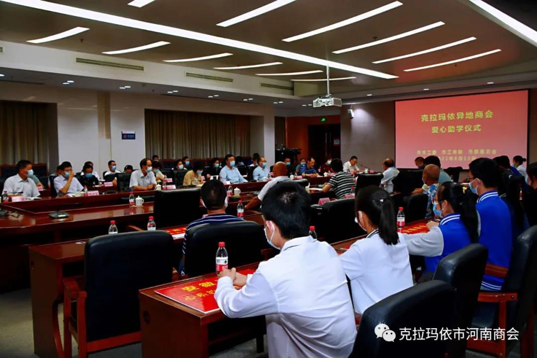 2021年8月13日,克拉玛依河南商会参加了由克拉玛依市关心下一代工作委员会和市工商联组织的异地商会爱心助学仪式。商会副会长王彬代表克拉玛依河南商会,和其他商会负责人一起,将各自商会捐赠的助学金交到学生手中。