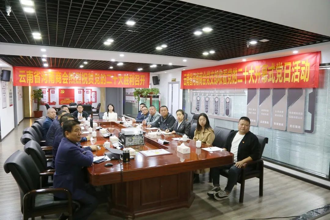 金秋十月,红旗飘扬,根据云南省异地商会党委通知精神和云南省河南商会党支部工作安排,2022年10月16日上午,云南省河南商会党支部组织党员、会员开展主题党日活动,收看中国共产党第二十次全国代表大会开幕盛况。云南省河南商会党支部书记、会长刘兴督,入党积极分子、常务副会长兼秘书长梁国平,中共党员、常务副会长吴勤山、张斌,商会党支部党员张凤森、季雪松、宋伟杰、任东伟、张凤丽,预备党员张宸,发展对象周文涛、宋尚贤,积极分子刘小凤、王军、张保琦、李立军、胡荣端、施昌利、狄海璞共计20人参加了活动,另有因出差、探家、疫情等因素不能到达会场的党员和发展中党员共23人通过各个渠道自行收看并回传了现场图片。