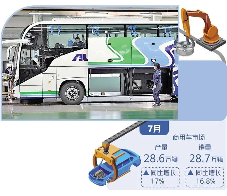 从数据来看,商用车产销已有向好迹象。中国汽车工业协会发布数据显示,7月,商用车市场产销分别完成28.6万辆和28.7万辆,环比分别下降16.4%和19%,同比分别增长17%和16.8%。与上年同期相比,7月客车、货车产销均呈现明显增长,其中客车产销增速高于货车。