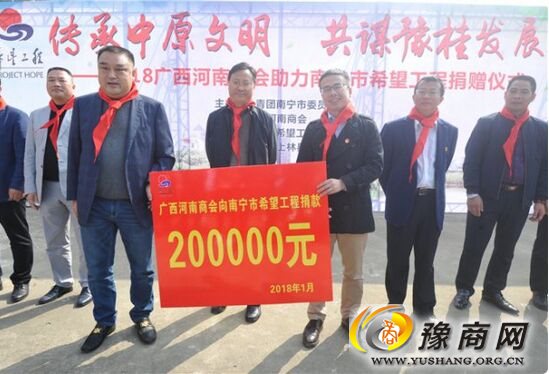 1 月 22 日,由共青团南宁市委、广西河南商会主办的广西河南商会助力南宁市希望工程捐赠仪式在上林县白圩镇中心小学覃排分校举行,广西河南商会不仅捐赠 20 万元现金,还给学校捐赠大米、食用油、衣物及学习、体育用品一大批以及爱心礼物,6 名贫困家庭学生代表领取了助学金。