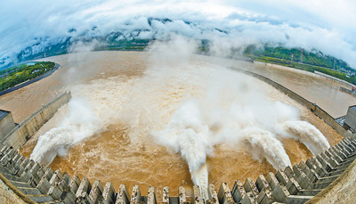 图为5日,江水通过三峡大坝泄洪深孔下泄。 |