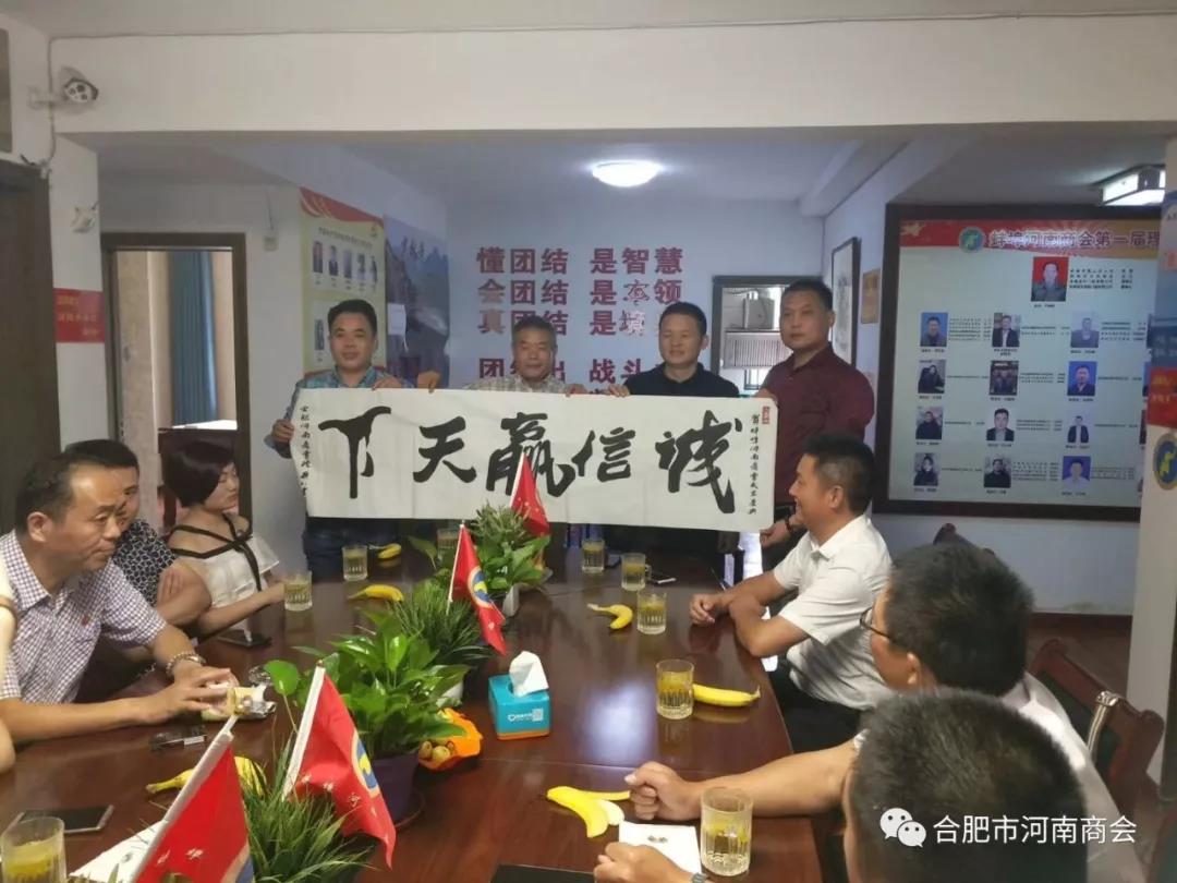 蚌埠河南商会会长牛瀚筠携副会长段练、曹晓房、赵朝龙、宋士林、惠晓敏及秘书处主任黄美玲给予了热烈的欢迎并进行了座谈。座谈会上,我会向对方赠送了原蚌埠市委书记徐景仁的墨宝“诚信赢天下”。双方将各自商会的建设和发展进行了深度的交流,共同发表了一些新的看法与好的意见。通过交流,我们了解到蚌埠河南商会虽然成立时间较短,但是发展相当快速,组织建设比较完善,不但建立了“商会党支部”还将商会会员家属组织在一起,成立了“商会妇联”,让家属也加入到商会组织中,使得彼此相互理解,相互支持,构建一个更加稳定幸福和谐的家庭。
