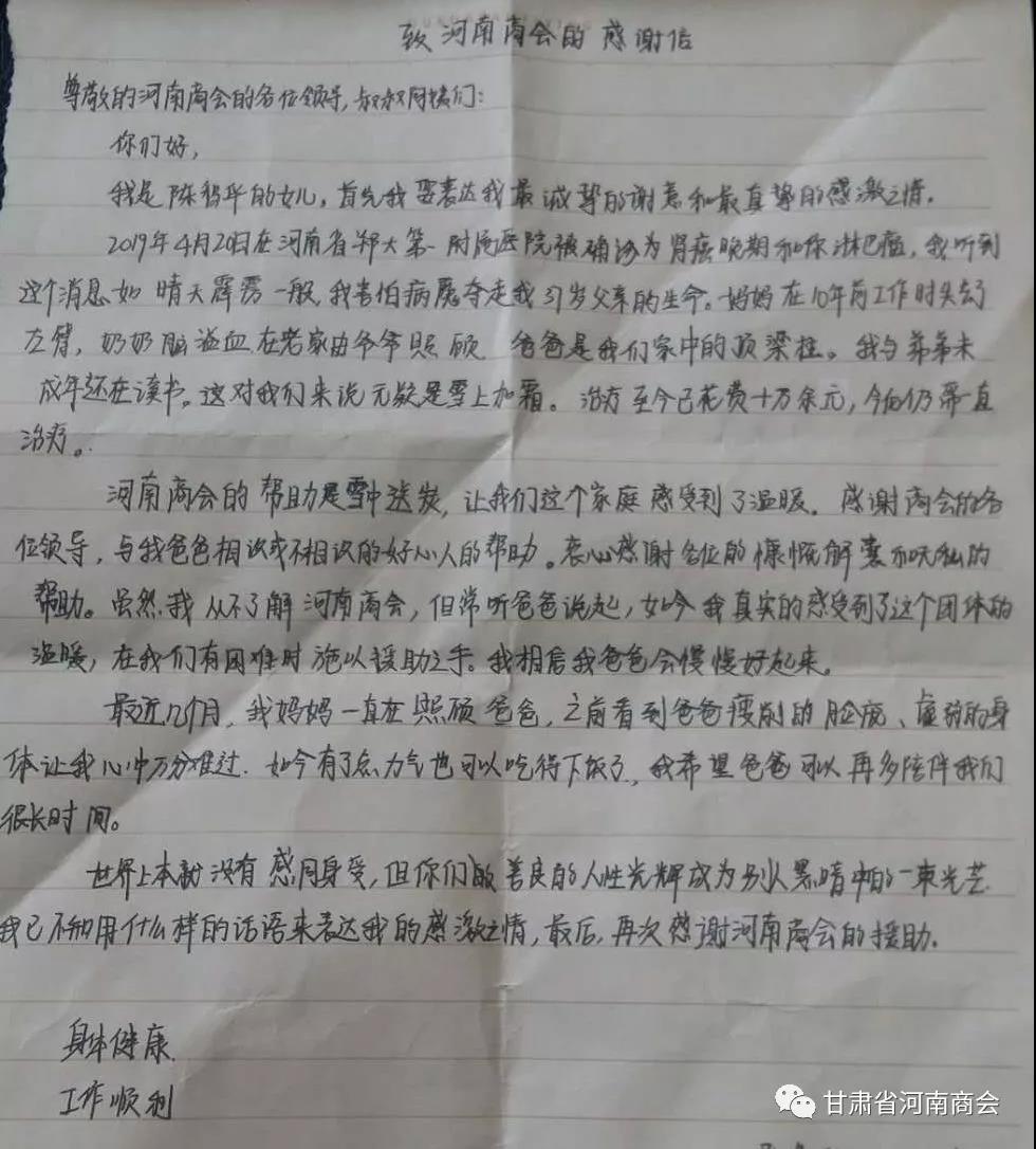 王主任把11900元爱心款交给了陈智华的姑娘。为感谢商会对陈智华的关爱,孩子写了一封«致河南商会的感谢信»。孩子在信中说:世上本没有感同身受,但大家善良的人性光辉成为别人黑暗中的一束光芒。