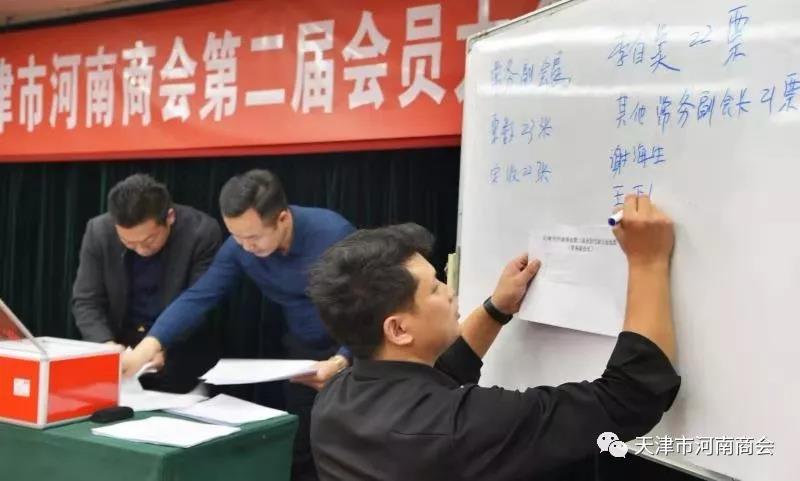 随后,大会审议通过了第二届《天津市河南商会章程(草案)》、和换届选举办法,计票人、唱票人、监票人和工作人员名单,根据商会《章程》,大会本着“公平、公正、公开、民主、规范”的原则,经无记名投票方式,选举产生了第二届理事会、监事会,并选举产生了会长1名、常务副会长8名,副会长9名。