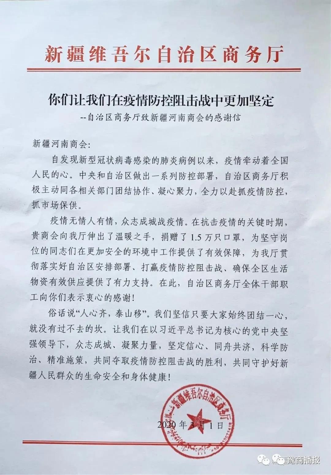 据新疆河南商会3月3日介绍,目前商会会员通过多渠道捐款捐物达200多万元。其中,朱军会长捐赠现金10万元,捐赠医疗物资17万元;刘涛书记捐款10万元,捐赠物资价值10万元,名誉会长陈怀亮给新疆沙依巴克区捐款捐物8万多元。党员方面,商会书记刘涛、副书记朱军各捐1万元,全体党员共捐款4万多元。另据结束,3月7日,商会还向乌鲁木齐市防疫指挥部捐赠了一万只医用口罩。