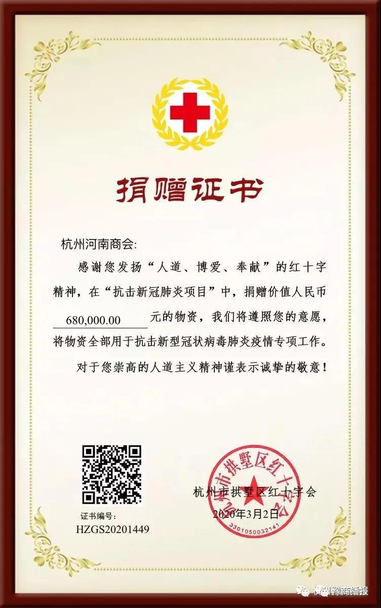 据杭州河南商会介绍,截止3月7日,杭州河南商会通过各种渠道向浙、豫两地及武汉捐赠款物共计2366198.80元,现金223300.00元,物资2142898.80元,其中向拱墅区红十字会捐赠物资680000.00元。
