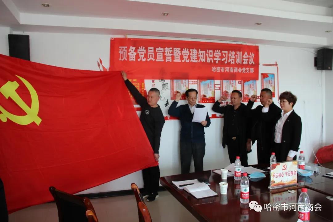 4月3日下午,哈密市河南商会举行预备党员宣誓暨党建知识学习培训会,支部成员、预备党员及入党积极分子参加了会议。会议由李国欣秘书长主持,首先参会党员全体起立齐唱《国际歌》,同时向在湖北武汉抗击新型冠状肺炎牺牲的医务工作者默哀。秘书长李国欣简要介绍了3名预备党员的基本情况,宣读了哈密市民政局社会组织综合党委《对接收3名同志为预备党员的审批意见》,并带领3名预备党员在党旗下庄严宣誓。