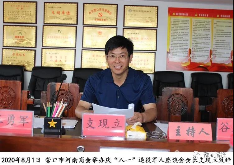 会长支现立致辞,今天,我们迎来“八一”建军节,在这美好时刻,我们满怀喜悦之情,在此欢聚一堂,召开营口市河南商会“八一建军节座谈会”,热烈庆祝中国人民解放军建军93周年。首先,向大家致以节日的祝贺!向长期以来关心、支持商会发展的各位退伍军人表示衷心的感谢! 向军属致以节日的问候和良好的祝愿!祝大家节日快乐、身体健康、工作顺利!