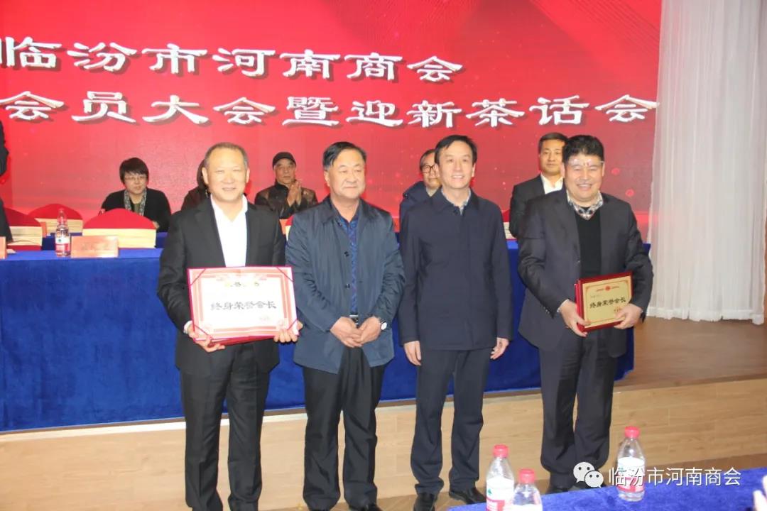 临汾市委统战部常务副部长任吉龙(右二)市工商联党组成员、副主席曹焕成(左二)向原会长齐安林(右一)、原常务副会长兼秘书长张聚田(左一)颁发“终身荣誉会长”荣誉证书