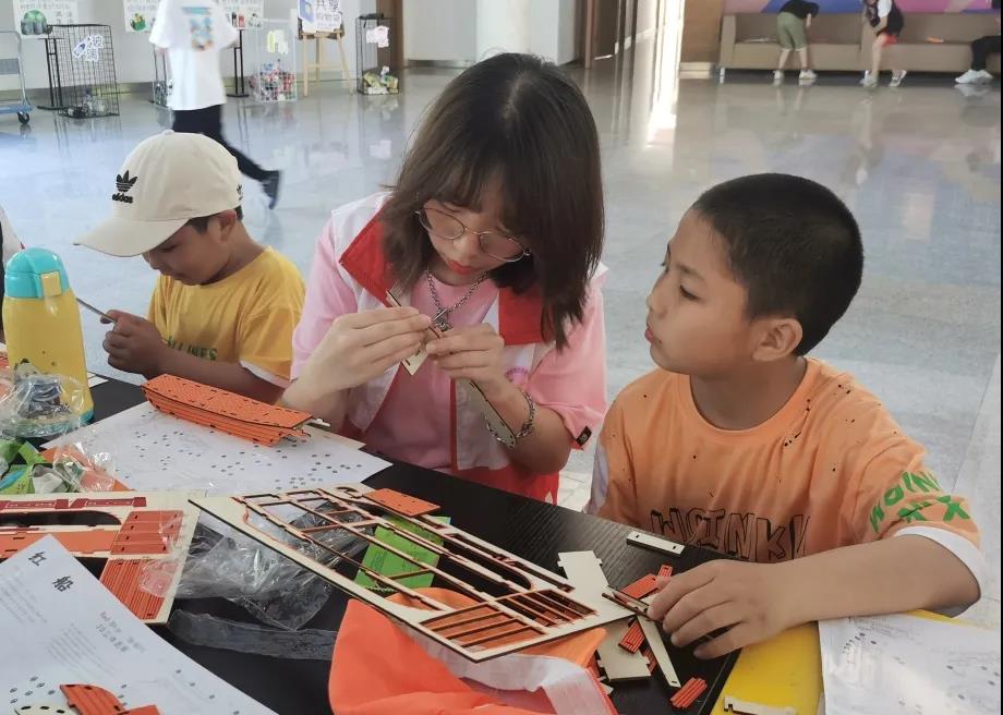大学生志愿者带领结对孩子耐心阅读红船模型的拼装说明书,结对孩子跟着志愿者姐姐、哥哥的步伐,慢慢的拼装出红船模型。速度较快的结对孩子还时不时的去帮助其他小朋友,大家分享组装心得,交流热烈,气氛融洽。不一会儿,一个个红船在孩子们的手中成型……