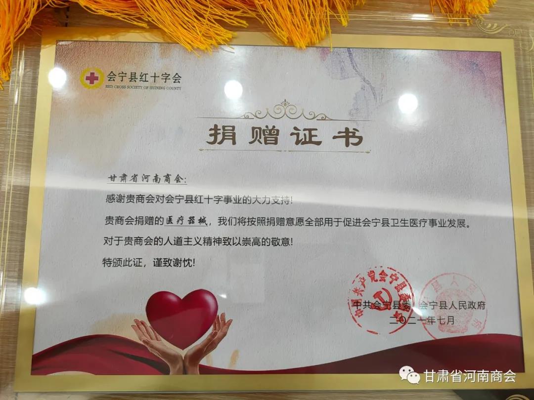 7月9日下午,甘肃省工商联专项主题活动--“光彩会宁行”活动之一的“保医”专项行动的捐赠仪式在会宁县开幕。甘肃省河南商会会长、兰州新光药业集团公司董事长谭栋来、甘肃省河南商会秘书长贾世洪、甘肃省河南商会执行会长、兰州雅达建筑节能科技有限公司总经理刘林林参加捐赠仪式,并将价值120.64万元的半自动体外除颤仪、负压呼引器、医用口罩,送交到会宁县卫生健康局。
