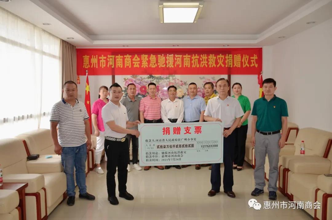 7月26日上午,惠州市河南商会会长王建、监事长林全武、副会长王广立、张国伟,秘书长王有钱、秘书处陈军等一行代表惠州市河南商会向河南省人民政府驻广州办事处捐赠救灾款(275222)元,支持家乡抗洪救灾。