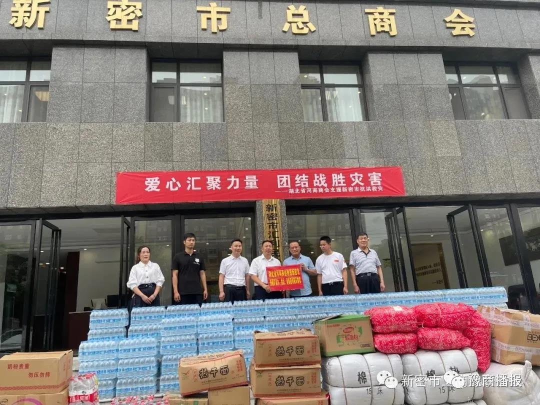 7月23日,湖北省河南商会会长张文启、副会长杨东旭赶往灾区,并发动湖北省河南商会爱心企业、爱心人士积极筹集物资发往河南郑州、新密等地,目前新密市工商联已接收到矿泉水、棉被、食品、消毒液等4卡车救灾物资。