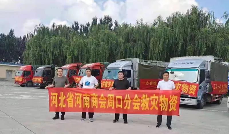 7月25日13时,河北省河南商会满载约35万元救灾物资的10辆大车,经过近13个小时辗转奔波终于到达扶沟县灾区。