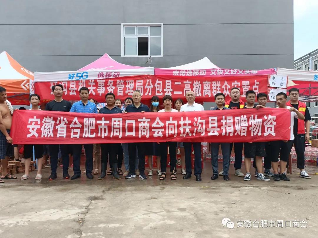 7月27日上午,合肥市周口商会会长丁红伟,执行会长梁言,常务副会长梁咏宽,副会长肖志江,监事长郑德林等带队将包括馒头、鸭蛋、八宝粥、火腿肠、牛奶、帐篷、睡垫、迷彩服等物品物资送往扶沟县安置点。