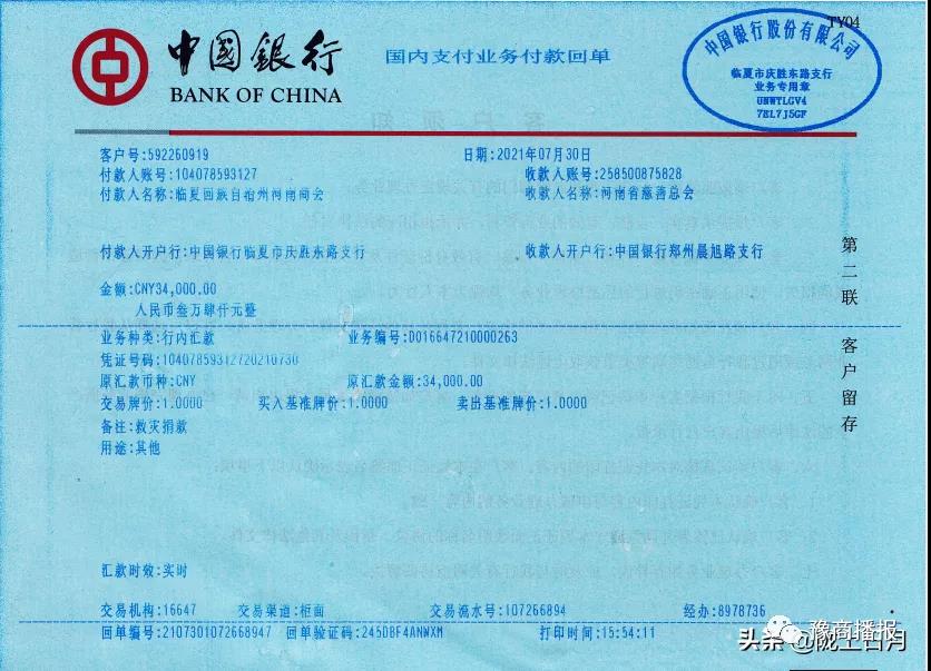 7月30日,临夏回族自治州河南商会将第二批34000元爱心捐款汇到了河南省慈善总会的账户上,希望支援家乡抗洪救灾和灾后重建。