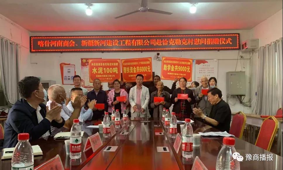 9月20日,喀什河南商会会长、新疆新河建设工程有限公司董事长陈勇带领商会一行,来到了岳普湖县也克先拜巴扎镇恰克勒克村,一次性向恰克勒克村捐赠水泥100吨,支持村容村貌建设整治,并向两个困难家庭捐助6000元帮扶资金,给三名困难学生捐助9000元助学资金。当天上午,喀什河南商会党委书记彭春辉还带领商会部分爱心企业与喀什慈善协会一起,开展了“中秋走访慰问”活动,来到疏附县站敏乡三村,给村民们捐赠了羊肉、清油、方便面、被套、衣服、床单等生活物资。