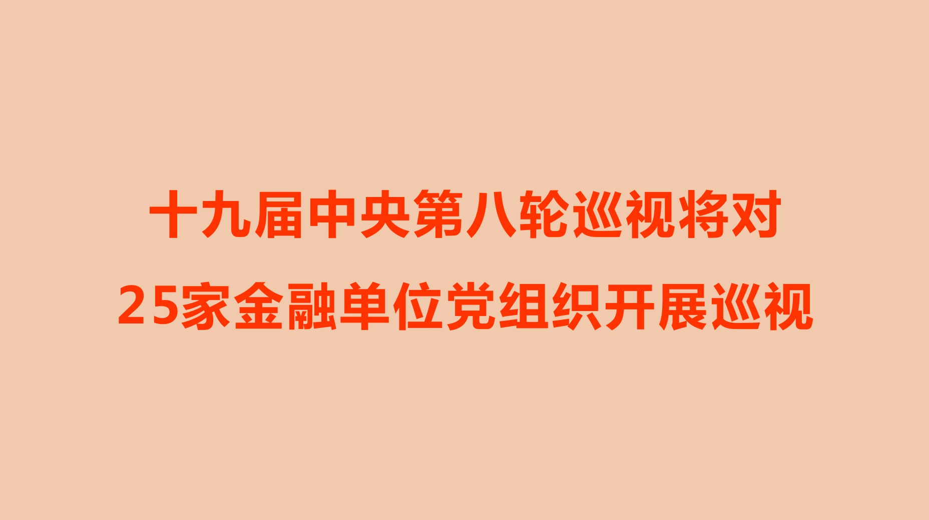 新华社北京9月26日电 经党中央批准,十九届中央第八轮巡视将对中国人民银行、中国银行保险监督管理委员会、中国证券监督管理委员会、国家外汇管理局、中国投资有限责任公司、国家开发银行、中国进出口银行、中国农业发展银行、中国工商银行股份有限公司、中国农业银行股份有限公司、中国银行股份有限公司、中国建设银行股份有限公司、交通银行股份有限公司、中国中信集团有限公司、中国光大集团股份公司、中国人民保险集团股份有限公司、中国人寿保险(集团)公司、中国太平保险集团有限责任公司、中国出口信用保险公司、上海证券交易所、深圳证券交易所、中国华融资产管理股份有限公司、中国长城资产管理股份有限公司、中国东方资产管理股份有限公司、中国信达资产管理股份有限公司等25家金融单位党组织开展常规巡视。