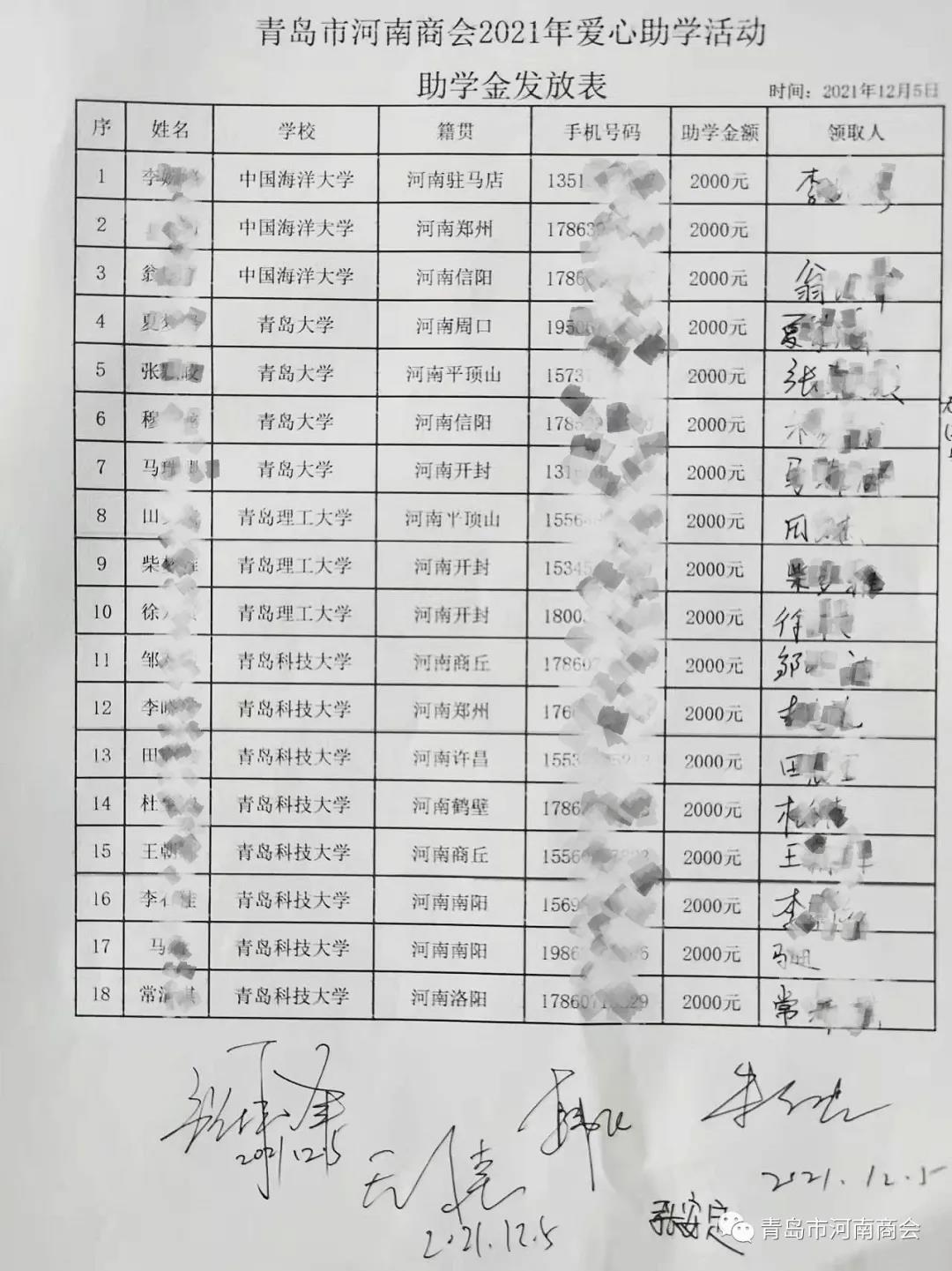 商会党支部书记、会长韩飞、轮值会长王国乾、常务副会长张振峰、副会长李星峰、杨利学、监事长朱红忠向参加本次爱心助学活动的17位豫籍大学生发放每位2000元助学金以及暖被。2021年助学金发放表(为保护学生隐私,姓名已作处理)。本次共发放助学金34000元,其中轮值会长王国乾个人出资6000元,4000元捐助本次助学金,2000元进入商会助学基金专项帐户。
