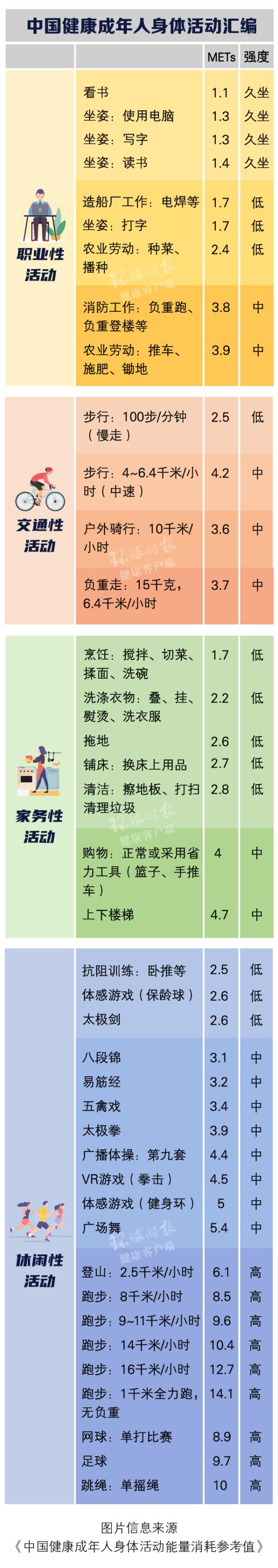 北京体育大学中国运动与健康研究院副院长张一民接受环球时报健康客户端记者采访时表示,身体活动是指可带来能量消耗的任何身体运动,分为职业、交通、家务和休闲四大类,具体形式多种多样。《汇编》中给每项活动都标注了运动强度,用MET值衡量。MET音译为“梅脱”,指活动时机体的代谢率相对于休息时代谢率的倍数。1MET定义为静息代谢率,即安静地坐在椅子上休息时消耗的氧气量。如果一种活动为2METs,说明其消耗的能量是静坐的2倍。根据MET还可以算出能量消耗,即1 MET=1千卡/公斤/小时。由此界定,久坐的消耗≤1.5METs,低强度活动为1.6~2.9METs,中等强度活动为3~5.9METs,高强度活动为≥6METs。
