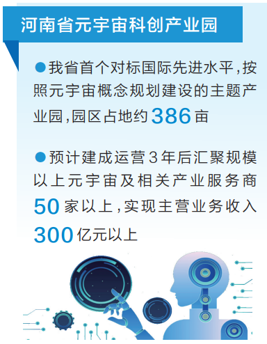 “目前产业园已同步启动土地招拍挂、规划设计招标和线上应用场景开发,并与20多家国内知名企业达成合作意向,预计建成运营3年后汇聚规模以上元宇宙及相关产业服务商50家以上,实现主营业务收入300亿元以上。”河南省元宇宙科创产业发展有限公司总经理文钊介绍。