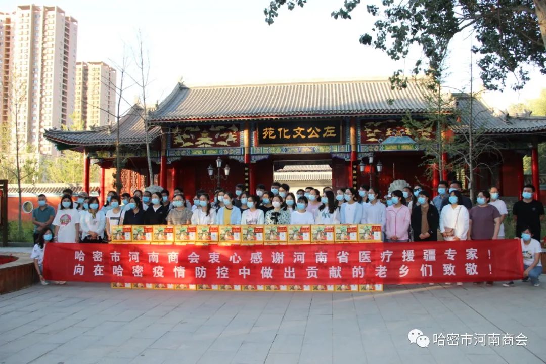 9月6日,哈密市河南商会在左公文化苑举行欢送会,为圆满完成哈密抗击疫情的河南省援疆医疗队82名队员送行。哈密市河南商会监事长曹爱华代表河南商会向医疗队员进行慰问,赠送慰问品,“豫哈情深一家亲,天山雪松根连根”,感谢他们不辞辛苦,无惧风险,与哈密人民共同打赢了疫情防控阻击战。