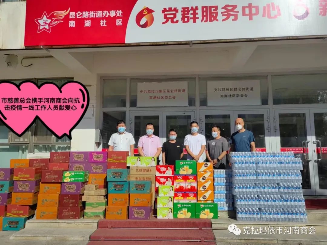 9月7日,克拉玛依河南商会一行走访慰问在南湖社区抗疫的医护人员和公安干警等一线人员,为他们送去价值1万余元的月饼、方便面、饮料、矿泉水等生活食品,以实际行动助力克拉玛依疫情防控工作。