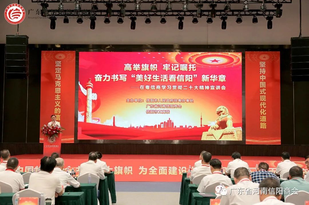 为了在第一时间让广大在粤的信阳 深入学习领会二十大精神,深入把握我们党执政规律、奋斗方向,10月26日,广东省河南信阳商会与信阳市人民政府驻粤办事处、信阳市工商联在东莞市厚街黄金小镇1号楼三楼会议厅联合举办了“高举旗帜、牢记嘱托、奋力书写美好生活看信阳新华章”的学习贯彻二十大精神宣讲会。