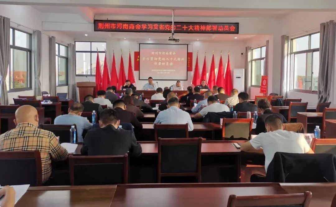 11月10日,荆州市河南商会召开学习贯彻党的二十大精神部署动员会。商会会长陈明胜提纲挈领地宣讲了二十大精神,并对今后学习提出了要求,强调加强组织,加强落实。商会常务副会长李永峰、理事周红丽就学习二十大精神分别作了交流发言。荆州市工商联直属会员企业党委组织委员、商会党支部副书记常玉华就学习贯彻党的二十大精神作指导讲话。商会党支部书记董文政表示,希望大家学以致用,把党的二十大精神落地生根。通过学习将思想源泉和现实路径融通成效,使商会健康、民主发展。