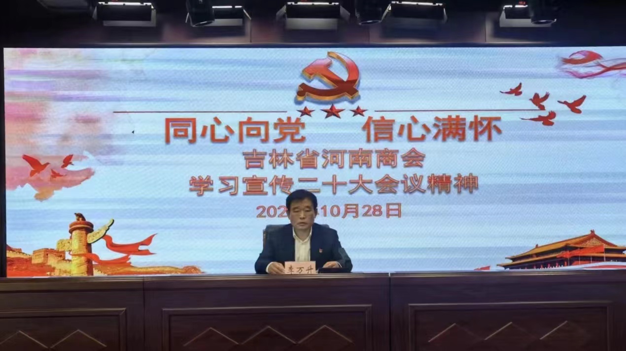 “党的二十大报告是一个全面建设社会主义现代化国家的纲领性文件,我们一定要遵循这个报告,坚持以习近平新时代中国特色主义思想为指导,增强四个自信,听党话、跟党走、感党恩,把伟大的建党精神应用到我们开拓事业当中去,为建设社会主义现代化强国而努力奋斗!” 常务理事、吉林省河南商会会长李万升表示,吉林省河南商会成立十一年以来,一直坚持党的领导,获得了诸多荣誉,发展得到了吉、豫两地政府大力支持和充分认可。未来一段时期,吉林省河南商会将把二十大精神作为根本发展思路,落实到实践中、体现在成效上。