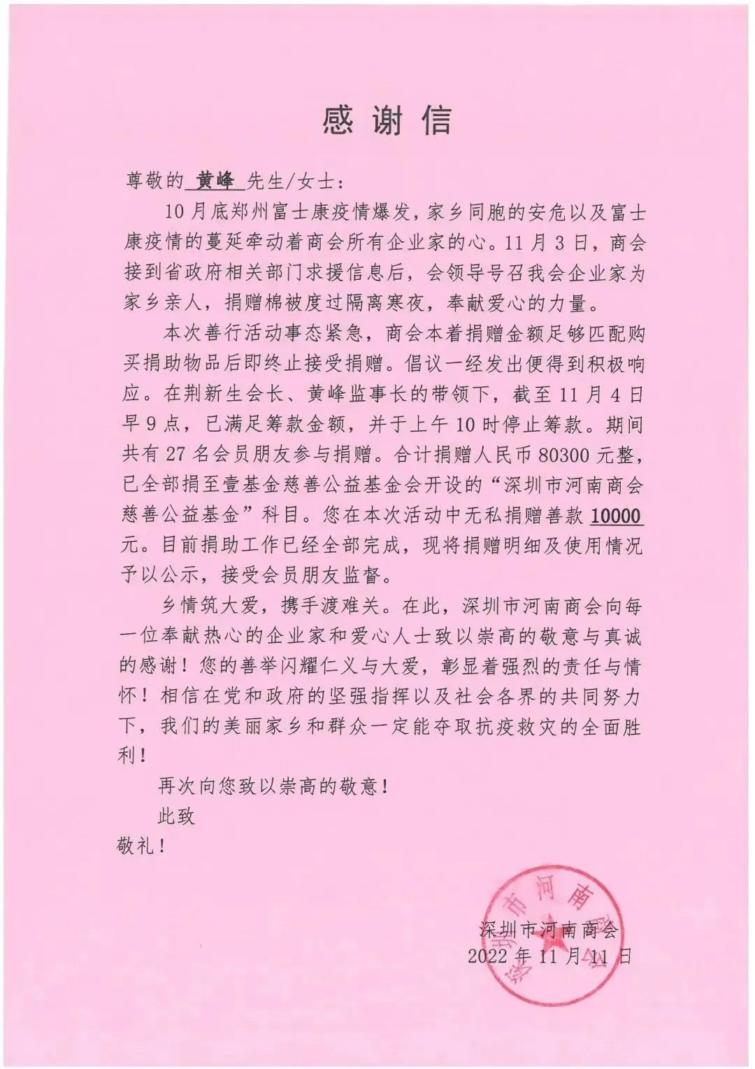 本次参与捐助人员共计27名,共募集到资金80300元,购买物资使用63700元,余16600元。余款存放在壹基金账户“深圳市河南商会慈善公益基金”科目,等待下个慈善项目使用。