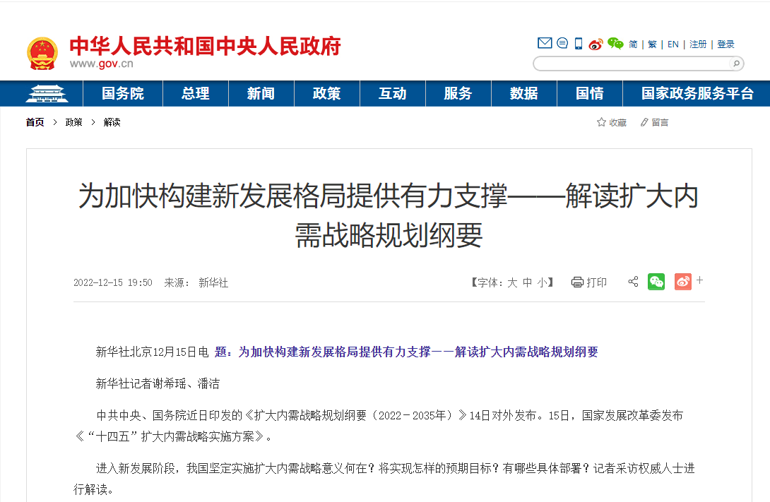 中共中央、国务院近日印发的《扩大内需战略规划纲要(2022-2035年)》于12月14日对外发布。12月15日,国家发展改革委发布《“十四五”扩大内需战略实施方案》。进入新发展阶段,我国坚定实施扩大内需战略意义何在?将实现怎样的预期目标?有哪些具体部署?新华社记者采访权威人士进行解读。