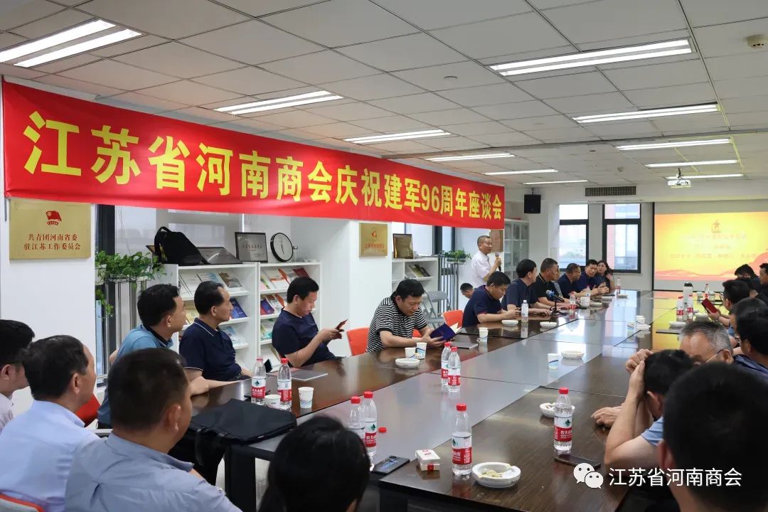7月29日下午,在“八一”建军节即将到来之际,江苏省河南商会举行庆祝建军96周年座谈会。商会成员中近二十名退役和现役军人、部分优秀企业家和领导欢聚一堂交流座谈。