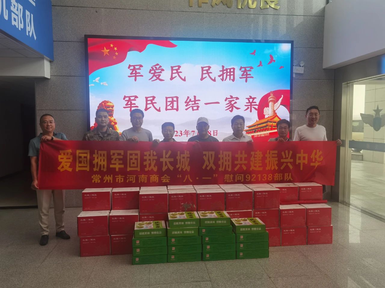 7月28日下午,常州市河南商会一行带着价值三万多元的水果、矿泉水和其他物品,到驻常空军部队慰问。