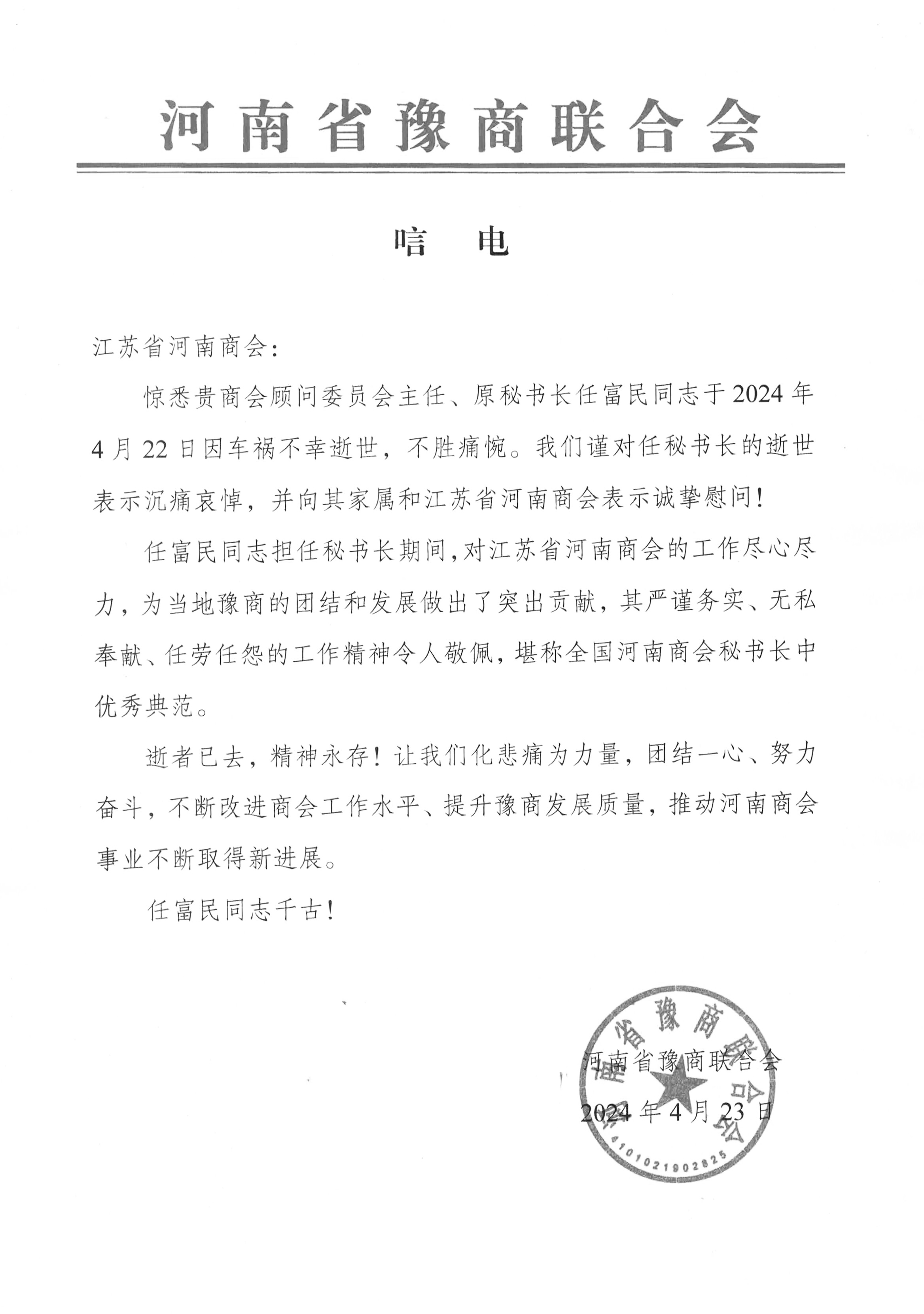 江苏省河南商会原秘书长任富民同志不幸逝世