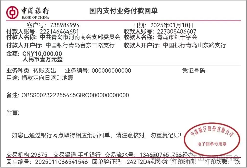 青岛市河南商会党支部发扬"一方有难、八方支援"的光荣传统,快速响应,开展捐款活动,1月10日向青岛市红十字会定向捐款1万元,用真情相助灾区群众救助和家园重建工作。通过此次捐款,青岛市河南商会党支部以实际行动诠释了"一方有难、八方支援"的互助精神,以实际行动助力地震灾区群众尽快恢复正常生产生活秩序。