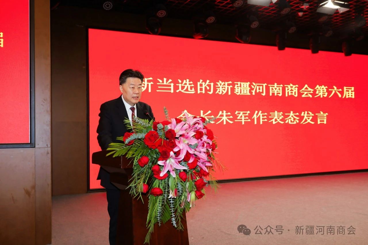 2025年2月26日上午,新疆河南企业联合会(商会)第六届会员大会暨第一次理事会在乌鲁木齐市明园新时代大酒店隆重举行。朱军当选第六届理事会会长。
