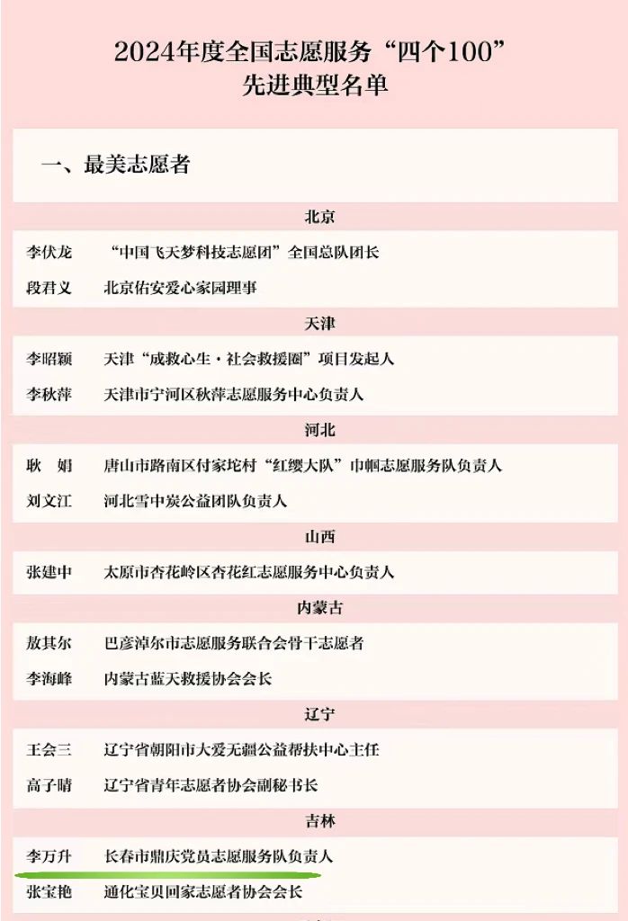 近日,2024年度全国志愿服务“四个100”先进典型揭晓, 常务理事、吉林省河南商会会长、长春市鼎庆公司董事长李万升荣获“最美志愿者”称号。该评选由中央社会工作部等22个部门和单位联合开展,旨在表彰在志愿服务领域有突出贡献的个人和组织。