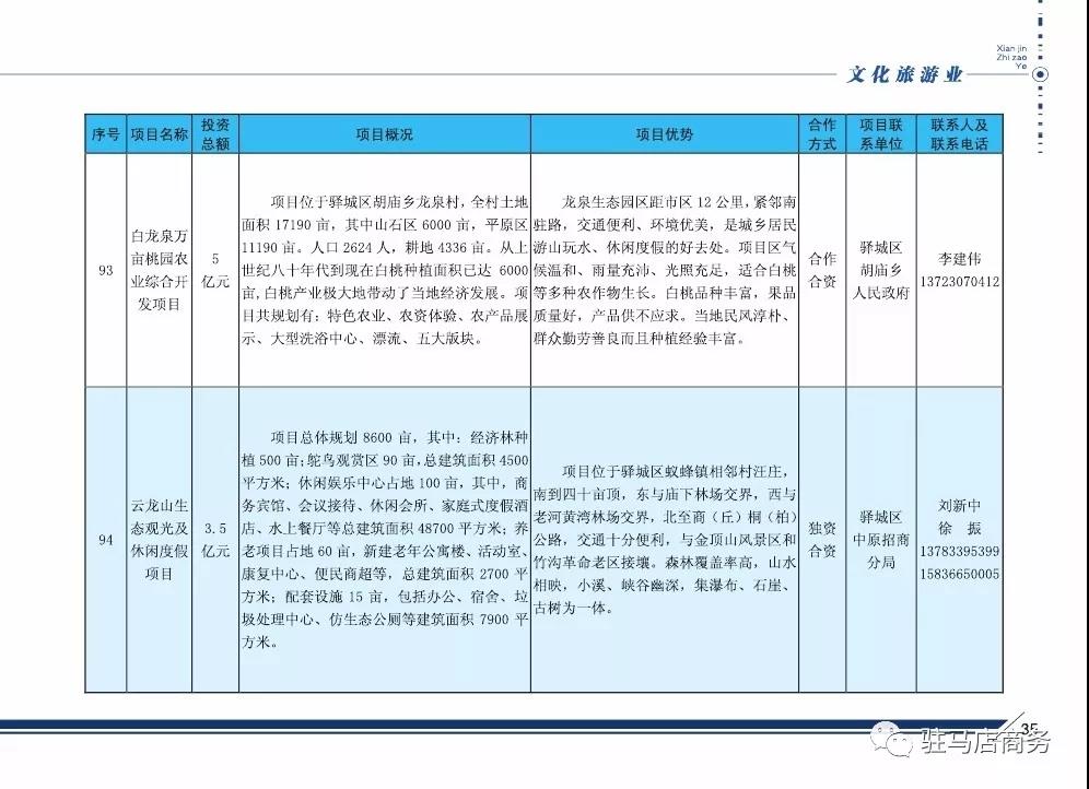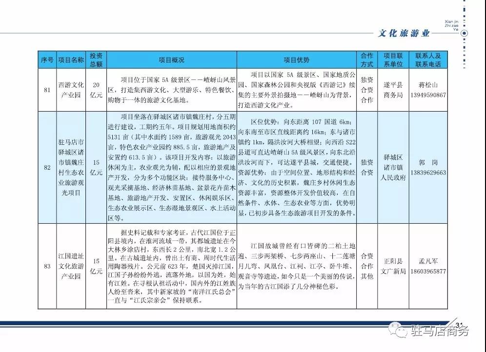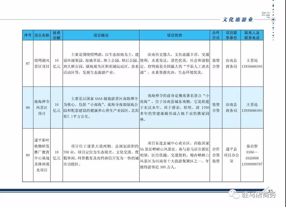 2018年驻马店市招商引资对外合作项目(文化旅游业)